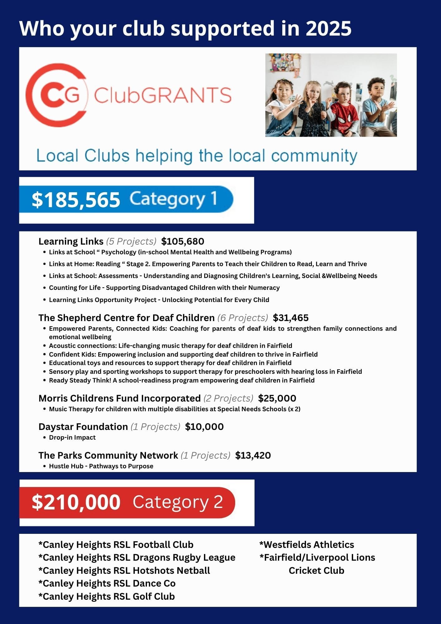 Learning Links Club Grants Donations 2024Club Grants 2025 Presentation Ceremony – Pictured with representatives from The Shepherd Centre & Learning LinksClub Grants 2025 – Learning LinksClub Grants 2025 – DaystarClub Grants 2025 – The Parks Community Network
