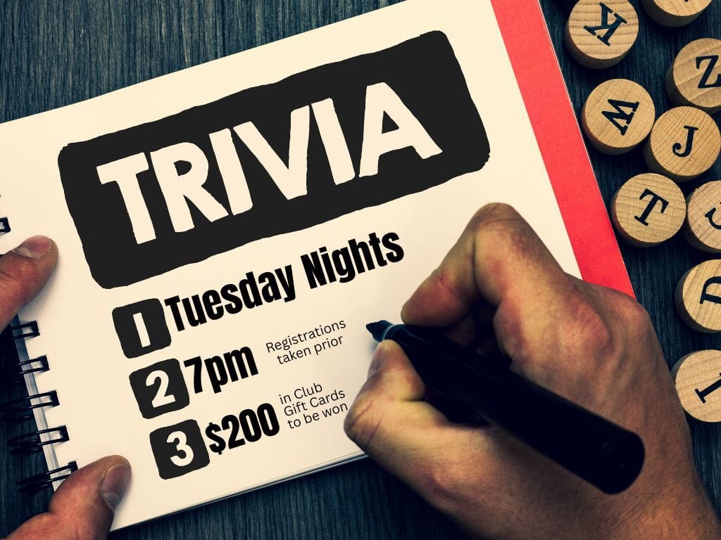 Trivia held Tuesday evenings from 7pm (Registrations taken prior)